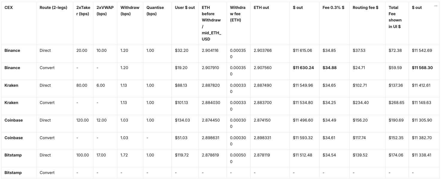 Systemscans 4 CEX: Kraken, Binance, Bitstamp, Coinbase to simulate and build the smart route. We always keep the EUR bridge under the hood. We consider:- Full cost at this notional (in bps from ~$11,610).