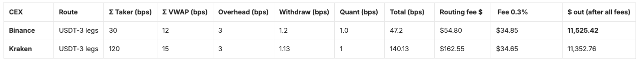 - The router picks the path with the lowest all-in cost (taker + VWAP + withdraw + quantize), which protects user payout and supports