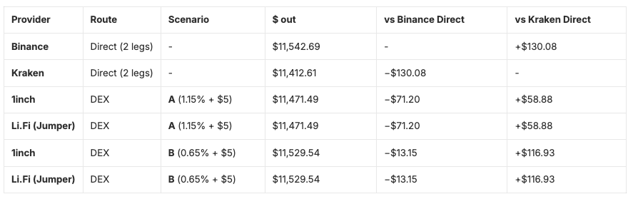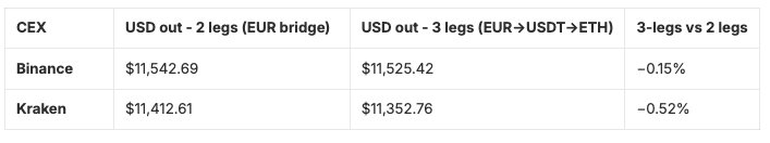 - Binance < Kraken on fees → higher ETH-out. On our EUR-bridge routes, Binance consistently prices better than Kraken at this notional.