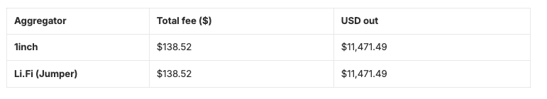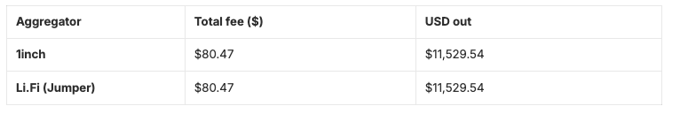 - Rule: pick lowest total bps; if gap ≤ 5–10 bps, prefer cheaper/faster withdraw. TTL=10s, batching 2–4× ok
