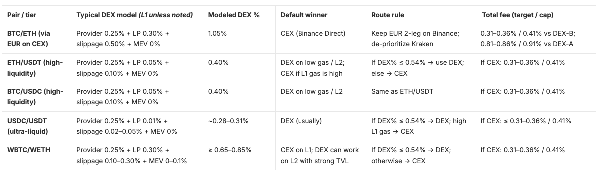 - Convert-EUR (2 legs): we price two converts (BTC→EUR, EUR→ETH) on each CEX. For illustration:Binance ≈ ~10 bps/leg (~20 bps total), Kraken Instant ~1%/leg (~200 bps), Coinbase retail convert ~50 bps/leg (~100 bps). This explains why Binance Convert often tops the table.