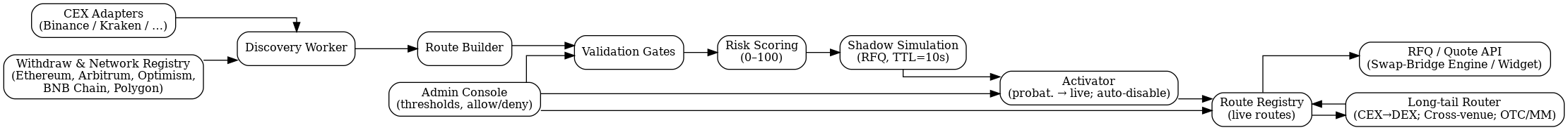 For assets not listed on CEX, we build a hybrid route: CEX → EUR/USDT → (bridge) → DEX swap → target token; in parallel we search for alternative CEXs that list the pair. (I’m not fully sure we always need an EUR leg, or whether we can interact directly with aggregators.)